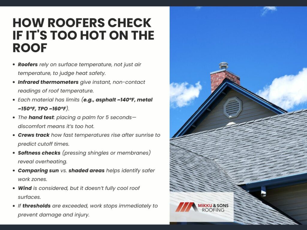 A bare palm placed flat on the roof surface for 5 seconds gives a practical check. Any discomfort or urge to pull away signals unsafe conditions.