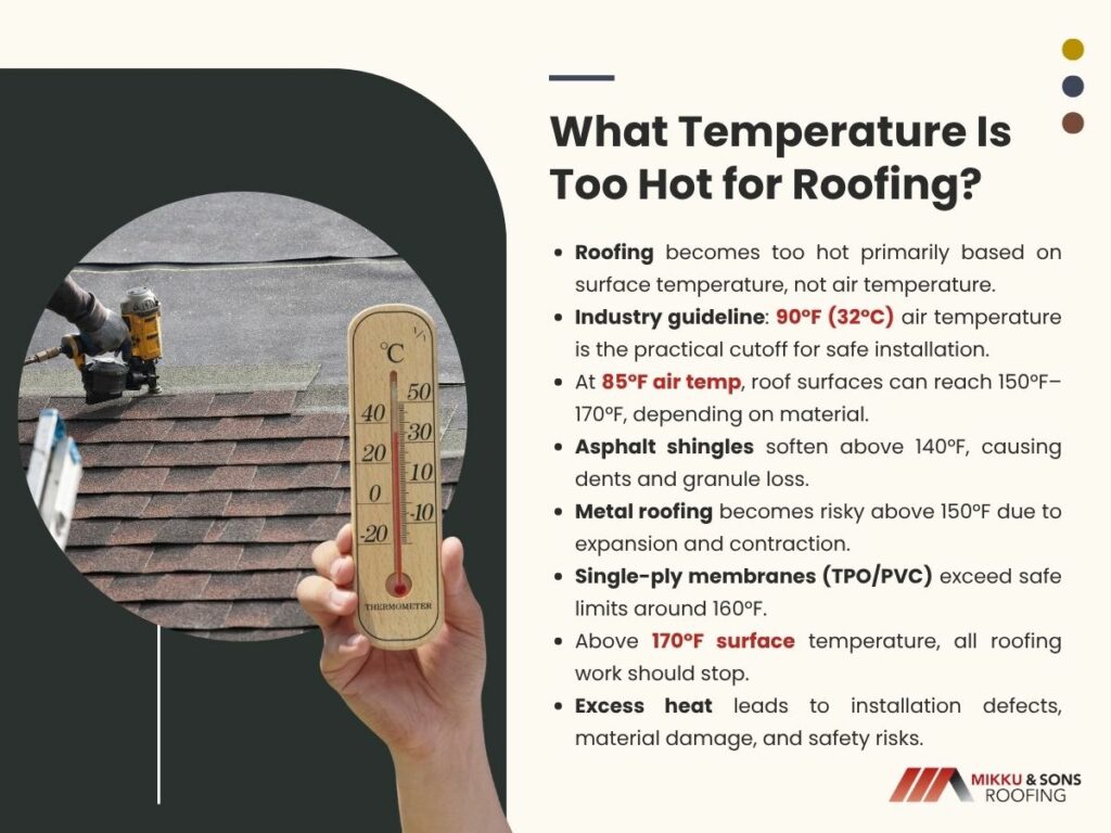 Heat degrades the physical properties that make a roof waterproof and stable. Installation at improper temperatures guarantees premature failure regardless of material quality.