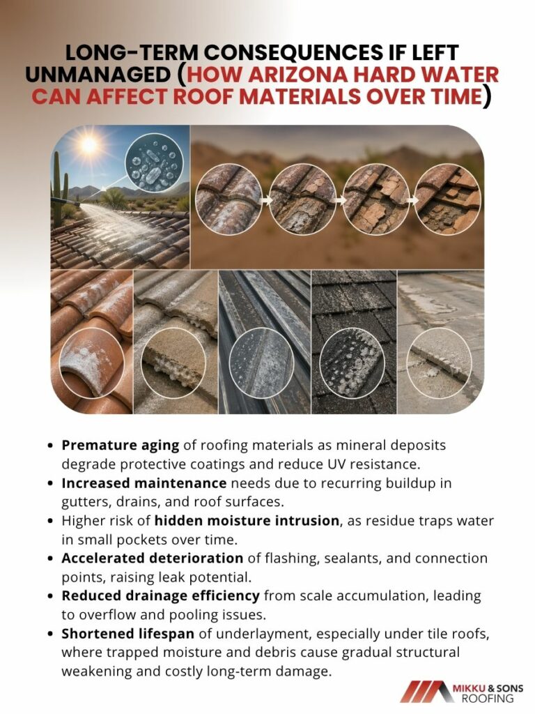 Arizona receives over 300 days of direct sunlight each year with UV indexes that regularly exceed 10. Asphalt shingles lose their oil content and become brittle within 10 to 12 years instead of the typical 25 year manufacturer warranty.