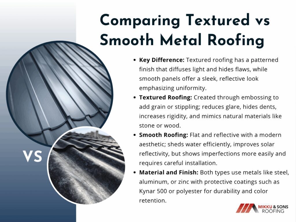 Metal roof texture impacts reflectivity, traction, and resistance to wear. Which Is Better for Your Home?Textured Metal Roof vs Smooth. Both styles can perform exceptionally when properly installed and maintained, but their differences matter in everyday use.
